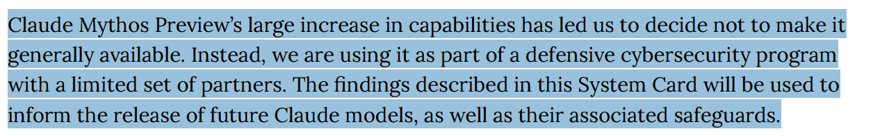 System Cardには脚注で「このモデルの一般公開を見送るという判断は、「責任あるスケーリング・ポリシー(RSP)」の要件に基づくものではありません。」と明記されています。Anthropic自身が、RSPの要件とは別に、自主的にこの判断を下しています。