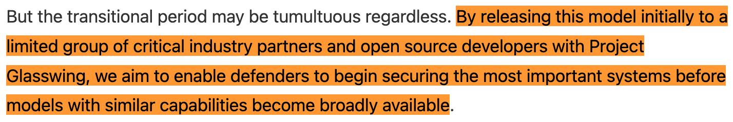 つまり、同等の能力を持つモデルが今後ほかの企業からも登場することを見越して、それに先んじて防御側の準備を進めてもらう、といです。