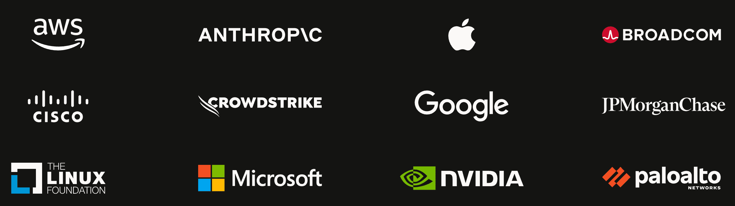 Amazon Web Services、Anthropic、Apple、Broadcom、Cisco、CrowdStrike、Google、JPMorganChase、Linux Foundation、Microsoft、NVIDIA、Palo Alto Networks