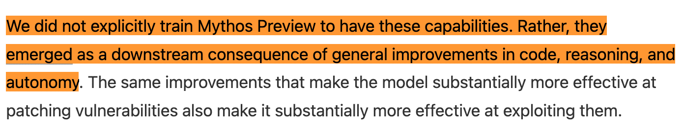 我々はMythos Previewにこれらの能力を持たせるための明示的な訓練は行っていない。むしろ、コード、推論、自律性における汎用的な改善の結果として現れたものである。