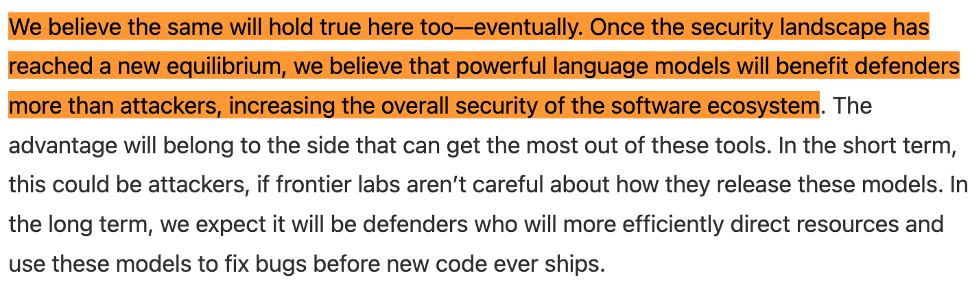 最終的には、ここでも同じことが当てはまると考えている。セキュリティの均衡が新たに成立すれば、強力な言語モデルは攻撃側よりも防御側に大きな恩恵をもたらすだろう。[...] ただし、それに至るまでの移行期は、いずれにせよ混乱を伴う可能性がある。