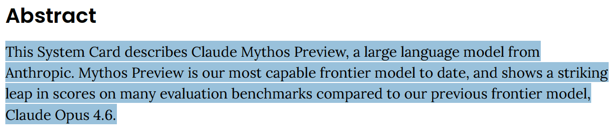 本システムカードでは、Anthropicが開発した大規模言語モデル「Claude Mythos Preview」について解説します。Mythos Previewは、当社のフロンティアモデルの中で現在最も高い能力を備えており、従来のフロンティアモデルであるClaude 4.6 Opusと比較して、多くの評価ベンチマークで目覚ましいスコアの向上を記録しています。