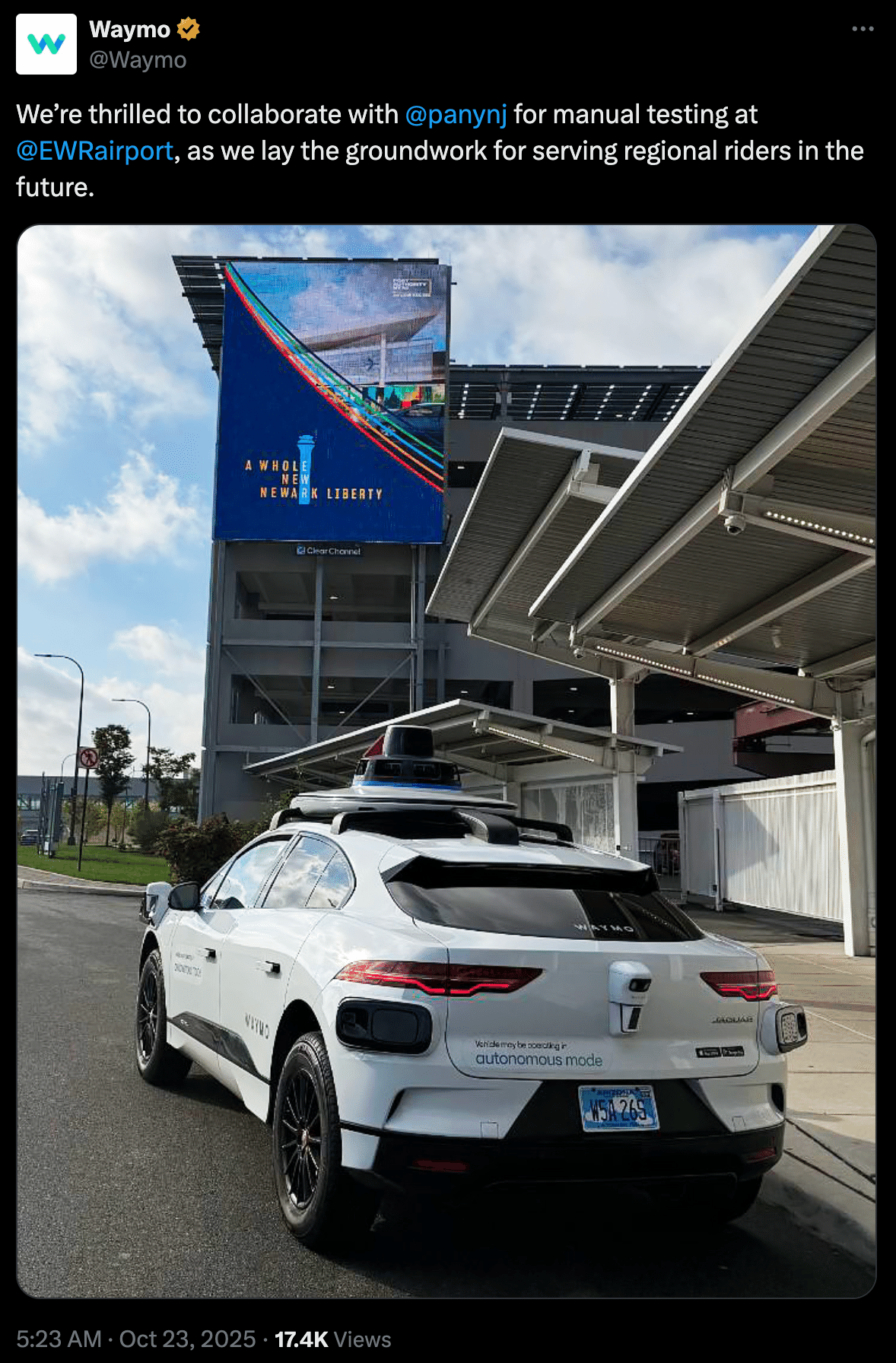 Waymo X投稿: Waymo to Test Vehicles With Humans at New Jersey Airport
