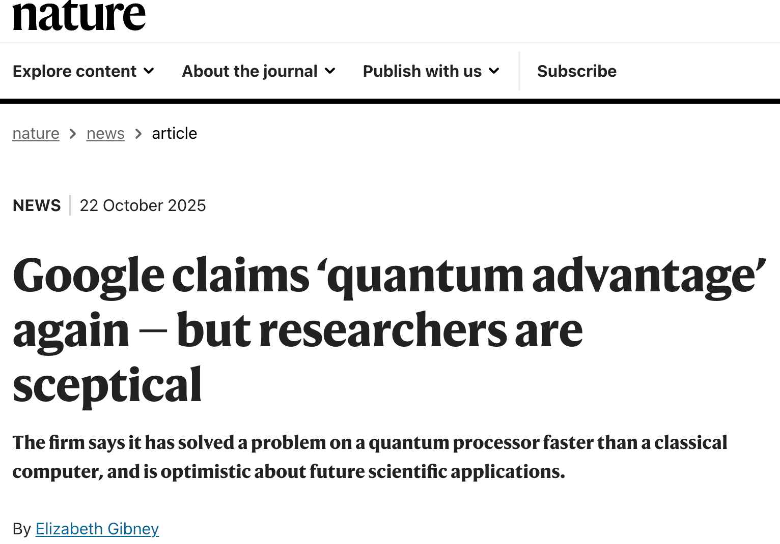 公式発表 (Nature): Google claims ‘quantum advantage’ again — but researchers are sceptical