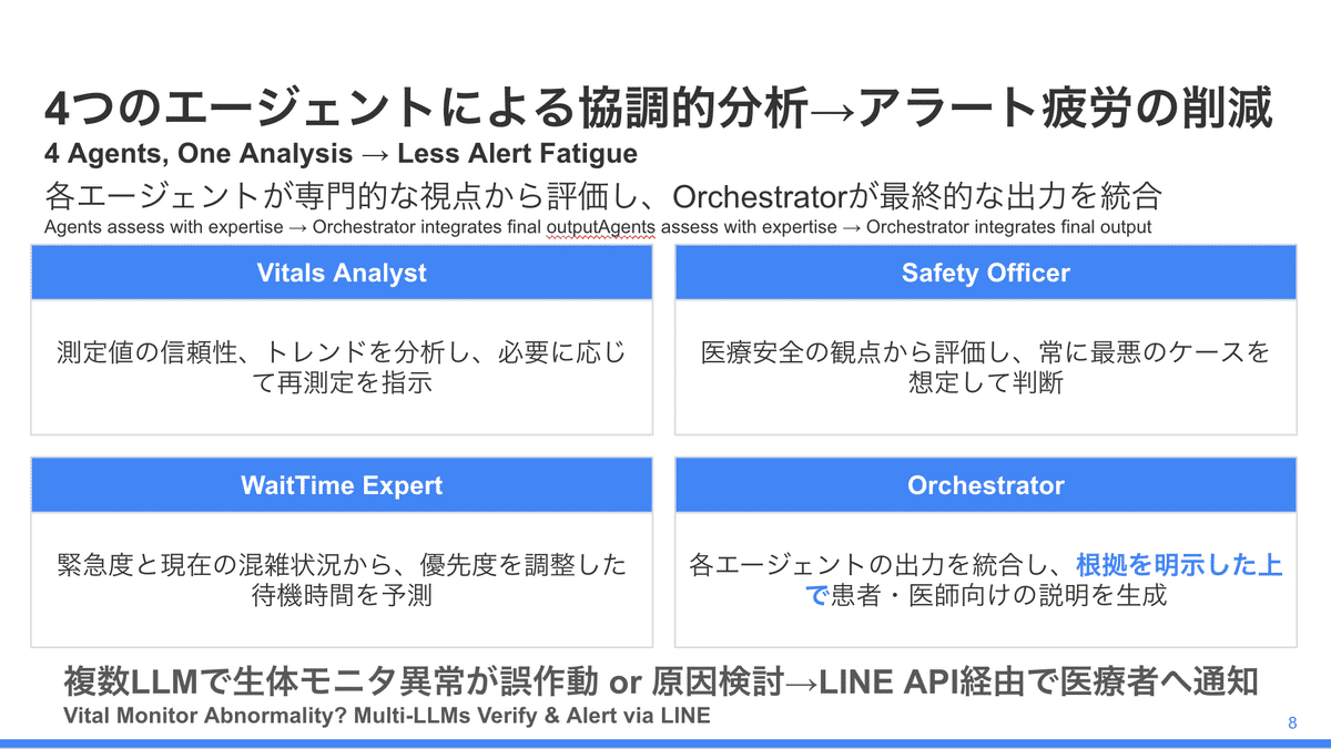 4エージェント(Vitals/Safety/WaitTime/Orchestrator)が協調し、モニタ異常の原因推定から安全性評価・優先度調整・説明文生成までを行い、その結果をLINE API経由で通知します。
