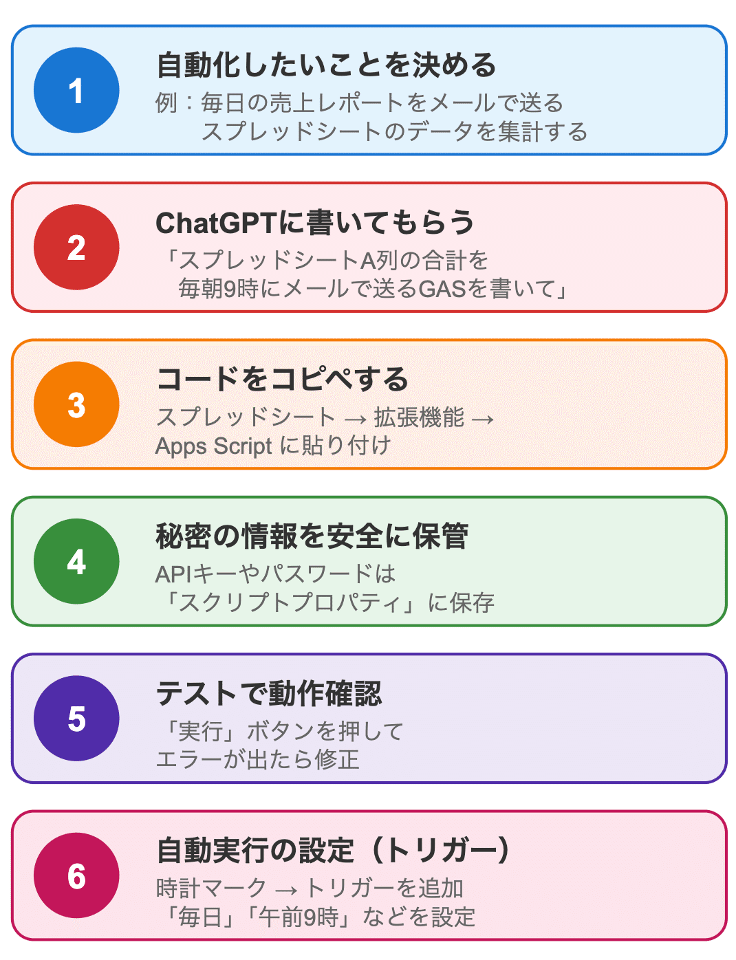 この記事では、以下のステップに沿って業務自動化を進めていきます。
