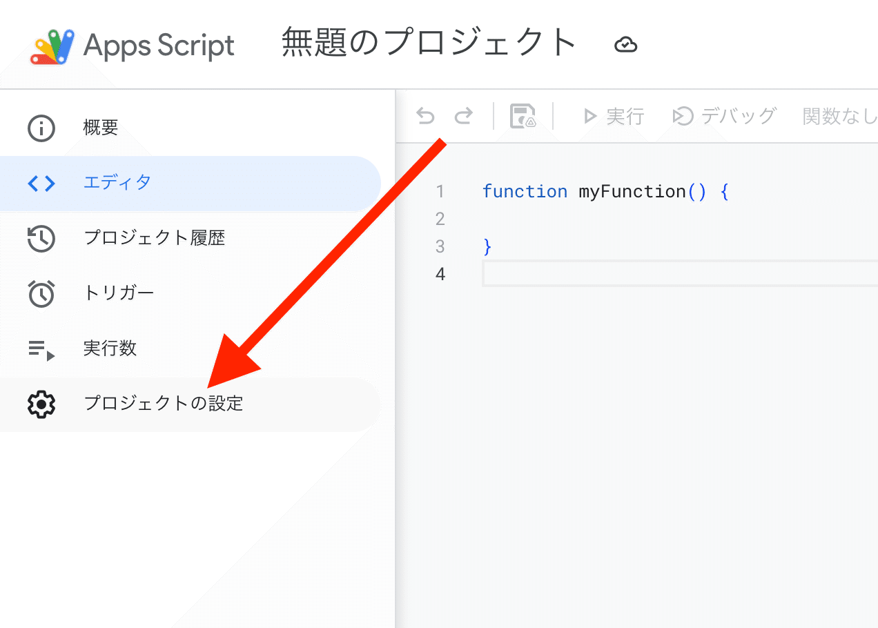 スクリプトエディタの左側メニューから、歯車の形をした「プロジェクトの設定」アイコンをクリックします。