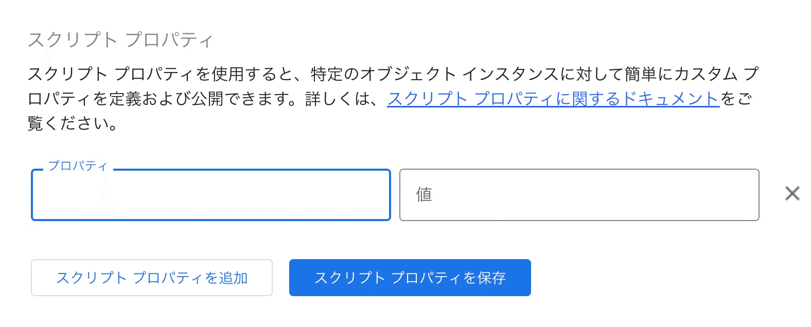 設定画面を一番下までスクロールすると、「スクリプト プロパティ」という項目があります。「スクリプト プロパティを追加」ボタンをクリックします。