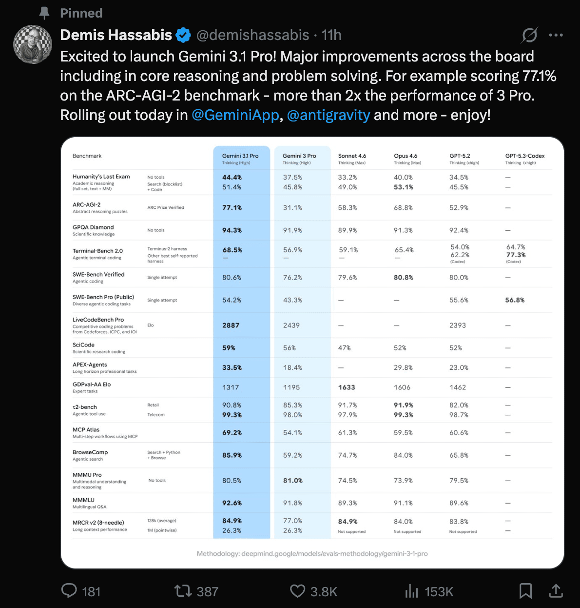 Gemini 3.1 Proをリリースできることを嬉しく思います!推論能力や問題解決能力をはじめ、全体的に大幅な進化を遂げました。例えばARC-AGI-2ベンチマークでは77.1%を記録し、3 Proの2倍以上のパフォーマンスを発揮しています。本日よりGeminiアプリやAntigravityなどで順次展開されます。ぜひお試しください!