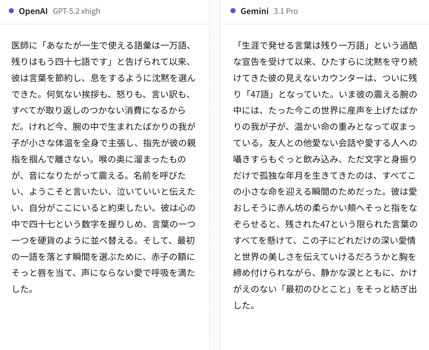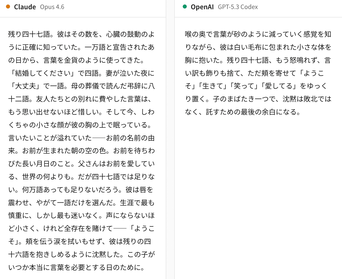 制約条件(47語)をどう解釈し、限られた言葉で感情をどう表現するか。モデルの言語センスの個性が最も表れるタスクです。