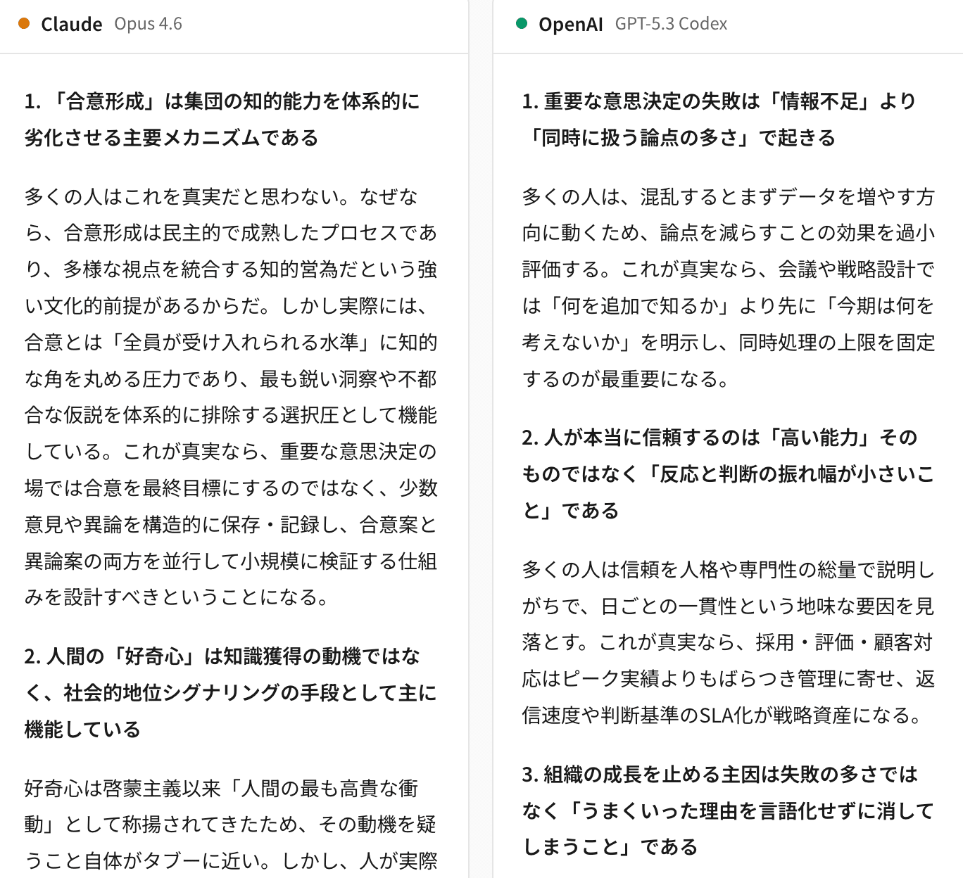 既存の知識を超えた独自の視点を提示できるかが問われます。正解のない問いだからこそ、モデルの思考の深さと独創性が試されるタスクです。