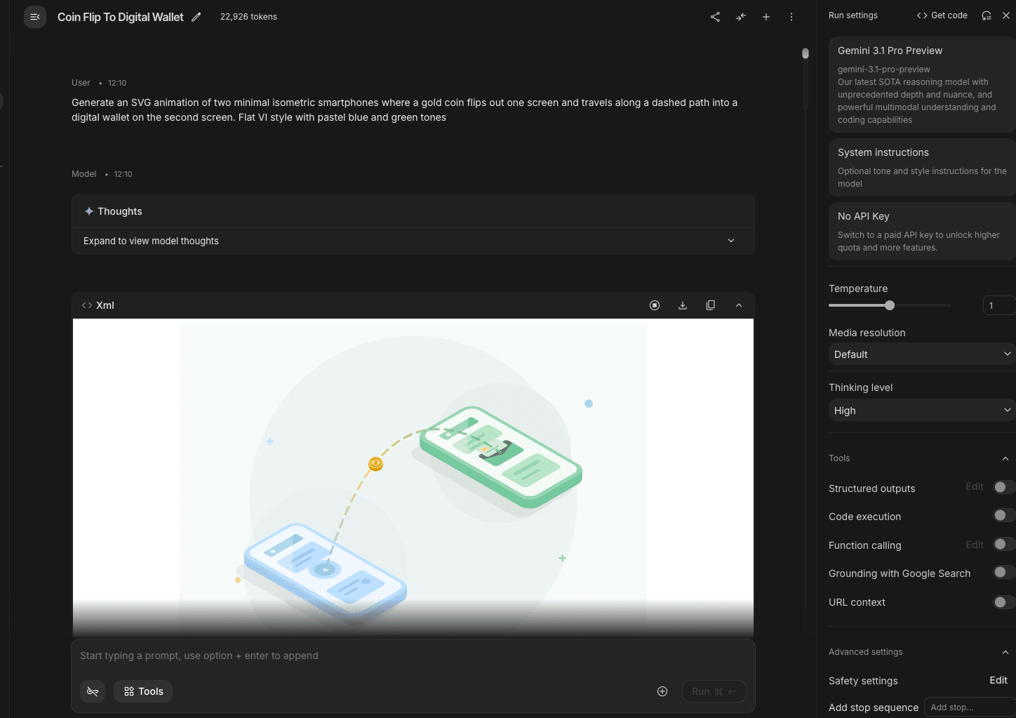 たとえばSVGアニメーションのプロンプトでは、AI Studio版がカラフルで詳細なイラストを出力したのに対し、ウェブ版は黒いシルエットだけの簡素な出力にとどまりました。