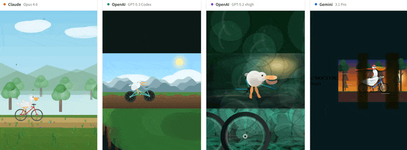 各モデルとも独自のアプローチでアニメーションを生成しました。ここでも Gemini 3.1 Pro の出力は動きの滑らかさやディテールの面で印象的で、ビジュアル面での強さが一貫して確認できます。