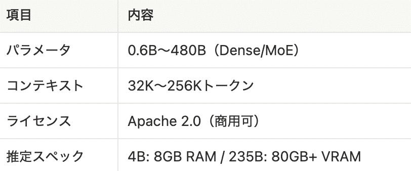 Alibaba Cloudが開発する多言語対応モデルファミリー。日本語の性能が高いと評判です。Apache 2.0ライセンスで商用利用可能なのが強みです。
