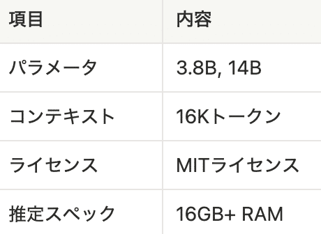 Microsoft Research製。16Bパラメータで70B級の推論性能を実現し、高品質な合成データによる学習が特徴です。