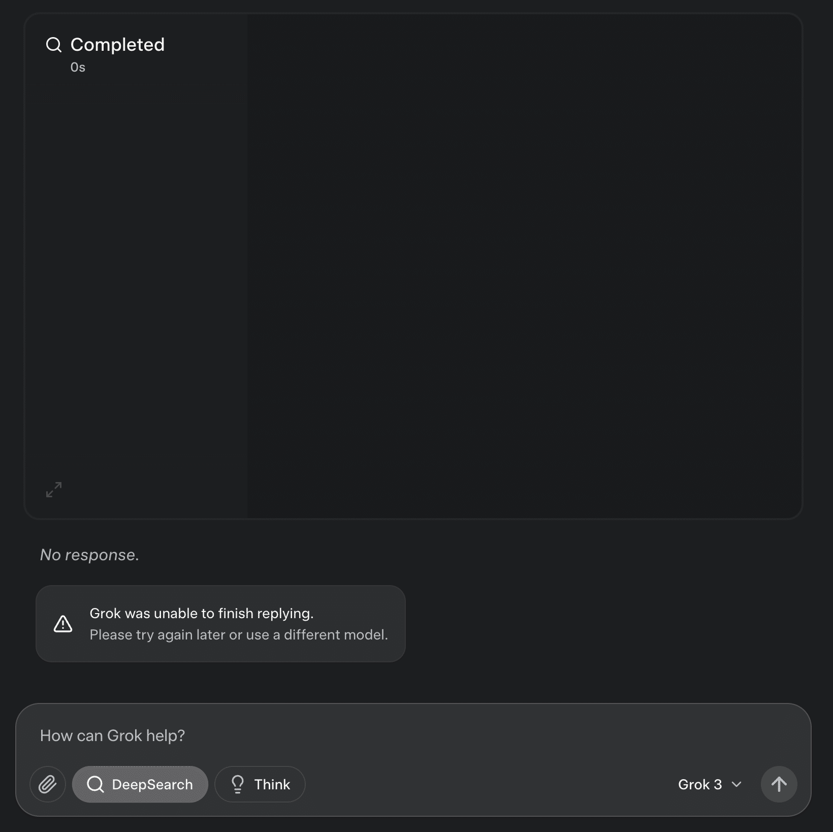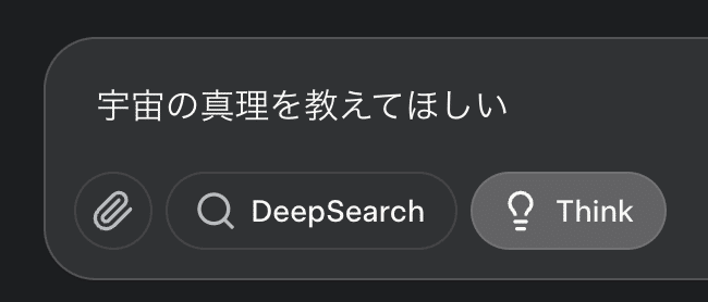 ただし、新機能の「DeepSearch」や「Think」モードは画面上に表示されるものの、現時点では機能を利用できない状態となっています。
