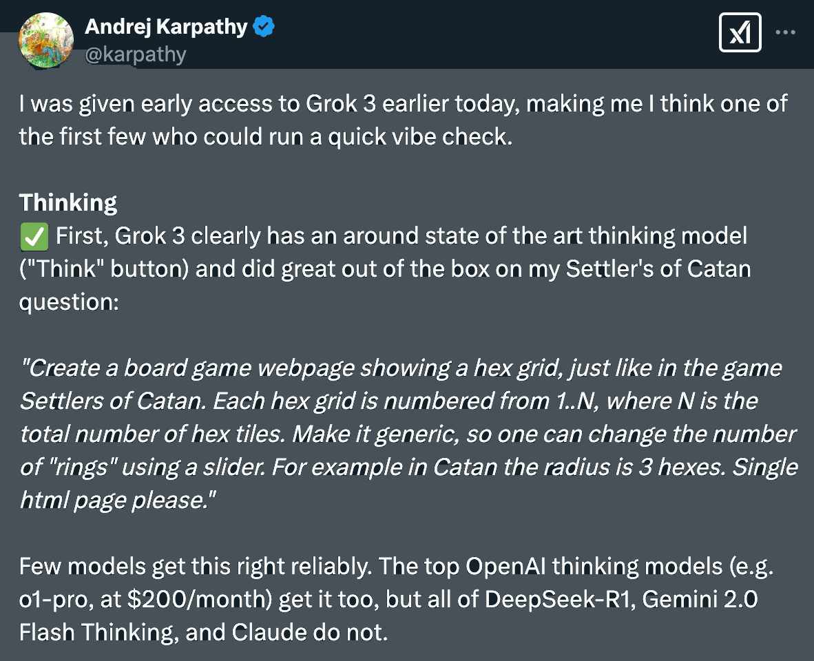 OpenAIの創業者であるAndrej Karpathysan氏は、先行ユーザーとしてGrok 3を使用した結果、プログラミングや数学的推論において、OpenAIのo1-proと同等か、それ以上の成果を示す場面もあったとXに投稿しています。
