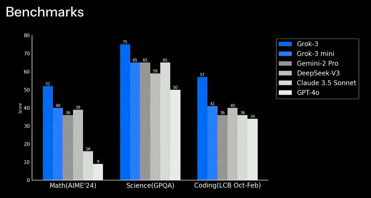 Grok 3は、従来モデルを大きく上回るパフォーマンスを各種ベンチマークで示しています。