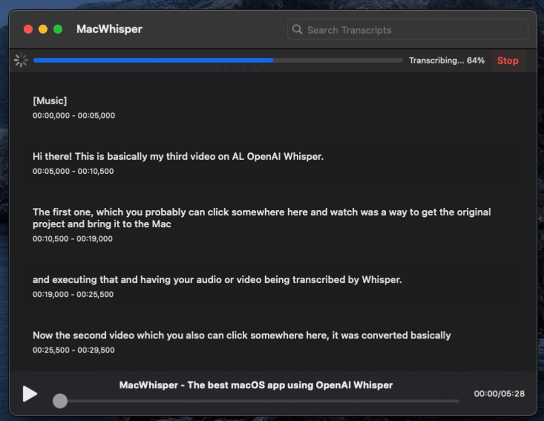 Whisper は Youtube のURLを貼り付けるだけで、文字起こしができます。URLからビデオを読み取り、オーディオに変換し、文字起こしを開始します。文字起こし中…