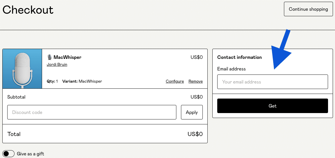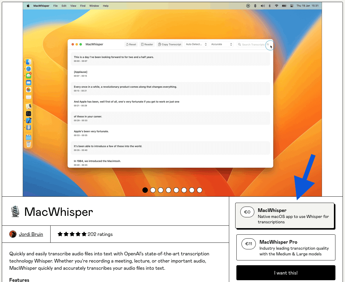Whisperアプリケーションは gumroad.com のウェブサイトで見つけることができ、無料で入手できます。ノーマルモデルと、Whisper Proの2種類が用意されています。ちなみに、基本的なYouTubeの動画だと、Proでなくても全く問題なく文字起こしができるので特別にビジネス用に使用しない限りは無料版で大丈夫だと思います!サイトに飛んだら、画像右下の様に、$0のMac Whisperが選択されているのを確認して、下の黒い部分の「I want this!」をクリックしましょう!