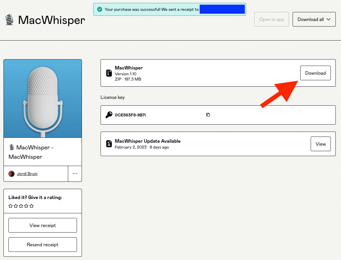 そうすると、次の様な画面に変わります。画面の上に、購入が完了したことを知らせるメッセージが流れてくると思うので、そうしたら、矢印のダウンロードをクリックして、Whisperアプリケーションが自分のMacにダウンロードされて、アプリケーションを使用できる様になります。