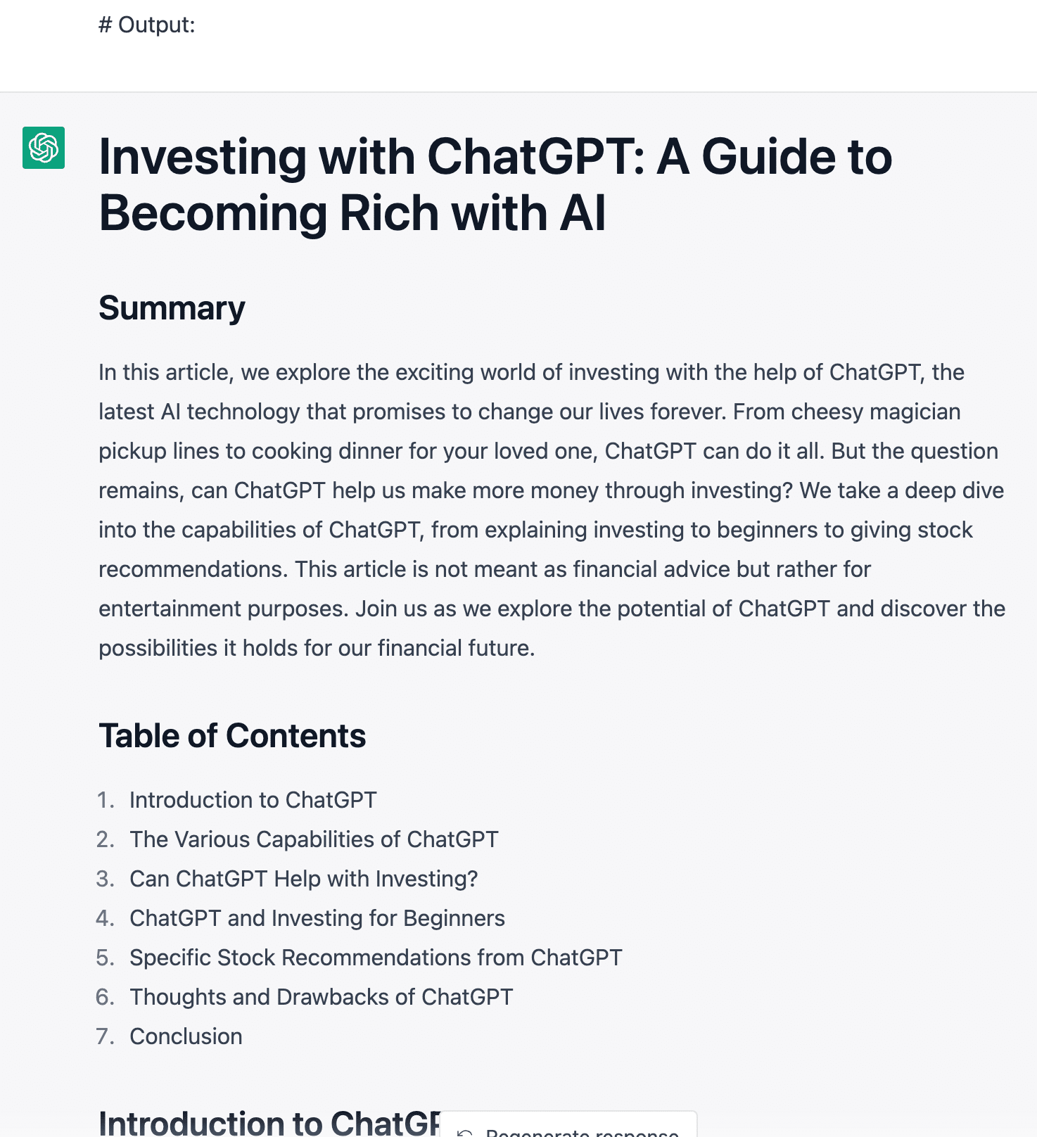 In conclusion, ChatGPT is an exciting and versatile tool that holds great potential for our financial future. From explaining investing to beginners to providing specific stock recommendations, ChatGPT is changing the way we approach finance. However, it is important to remember that no AI system can replace the expertise of a professional financial advisor and to always seek advice before making any major financial decisions.