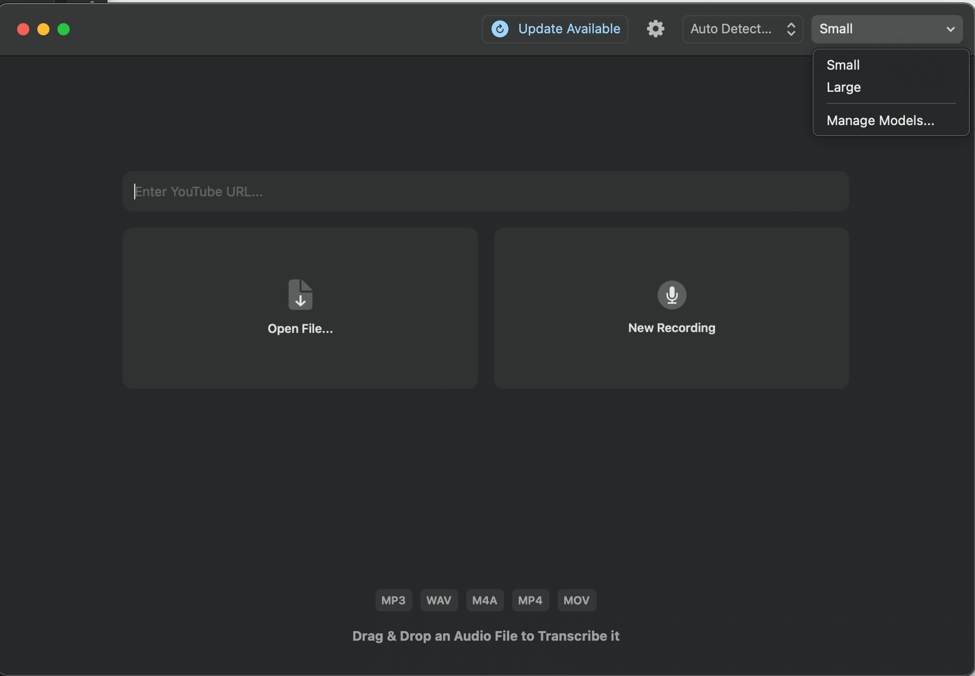 アプリケーションを開くと、右上に書き起こしたい言語を選択できます。自動で選択する Auto Detect というモードもあります。さらに、モデルの大きさ、Small か Large を選ぶことができます。Small だと素早い代わりに音声認識の精度が落ち、Large だと遅いですが、精度が高まります。