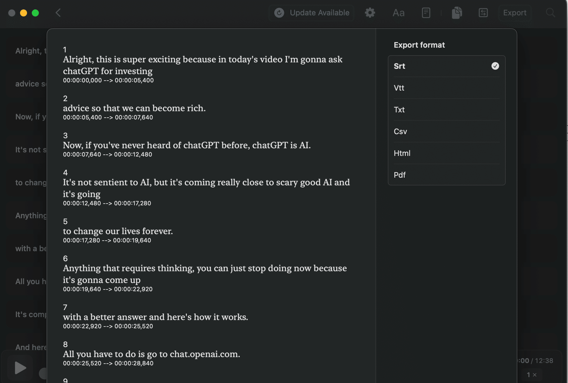 文字起こしが完了したら、右上の「Export」をクリックすることで、SRT、VTT、Txt ファイルなどの形式で保存できます。保存先を選択すれば、すぐに使用できます。