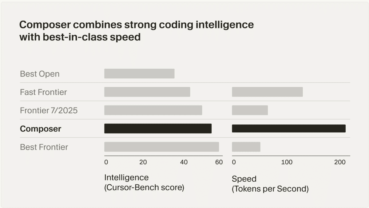 Best Frontier(Sonnet 4.5、GPT-5):性能はComposerをわずかに上回るが、速度は約50 tokens/secと大幅に遅い