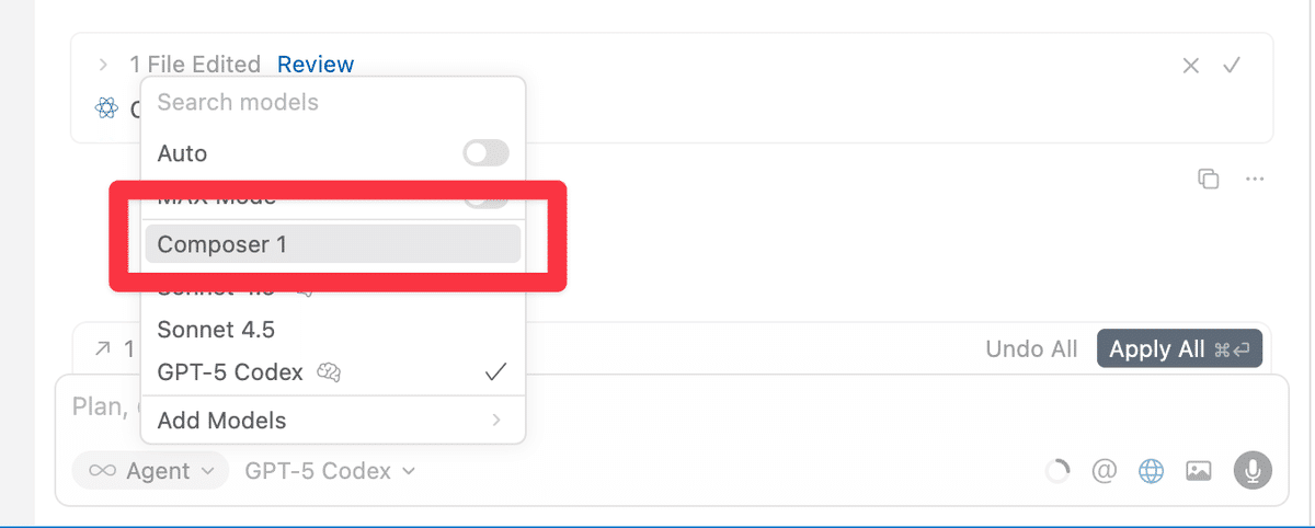 Composerは、Cursor初の独自コーディングモデルです。なお、以前は「エージェント」機能そのものを「composer」と呼んでいました。