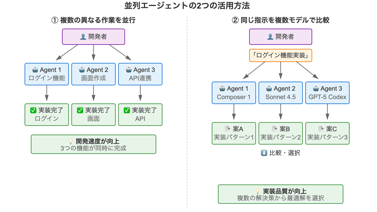 並列エージェント機能には、大きく分けて2つの活用方法があります: