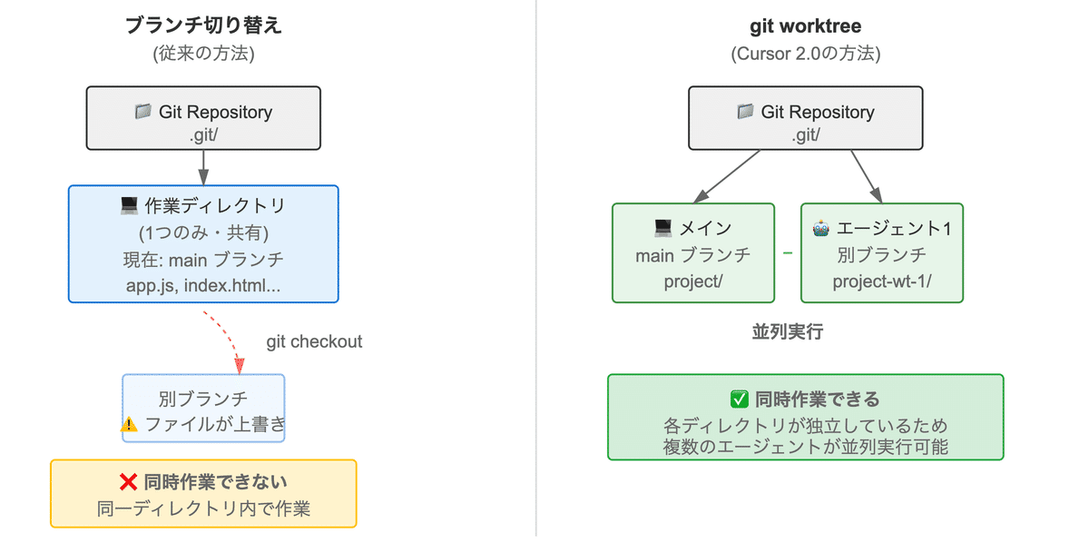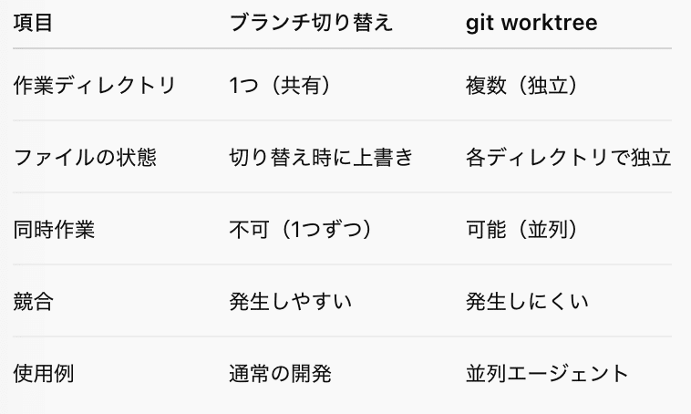 1つのリポジトリから複数の作業ディレクトリを作成できるGitの機能です。通常のブランチ切り替えとは異なり、物理的に別々のディレクトリを用意することで、各エージェントが互いに干渉せずに作業できます。