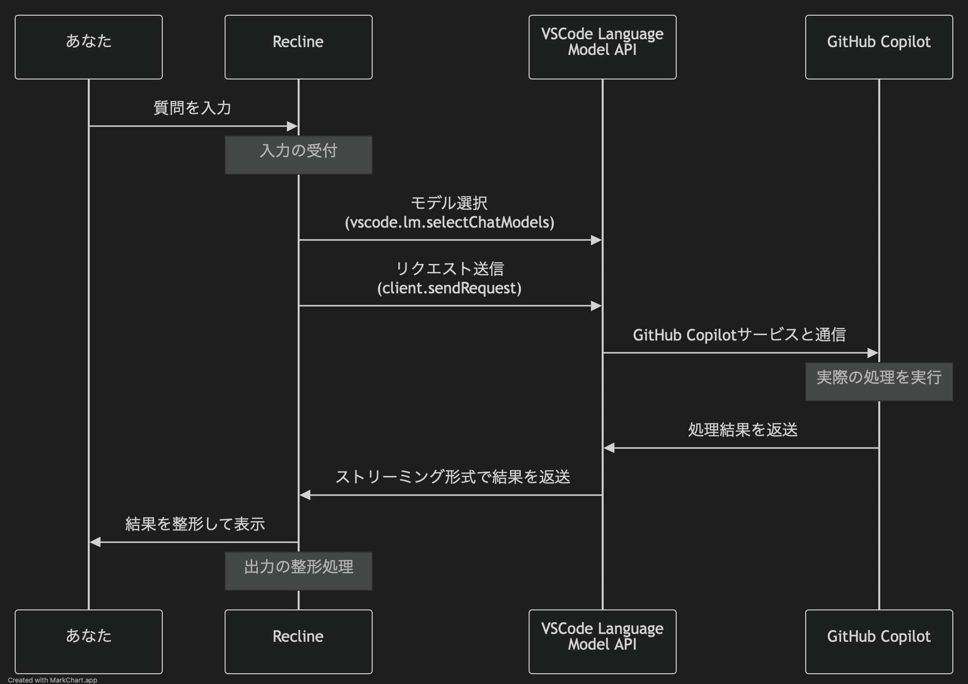 ReclineはVSCodeの言語モデルAPI(VSCode Language Model API)を利用して、以下のような仕組みで動作します: