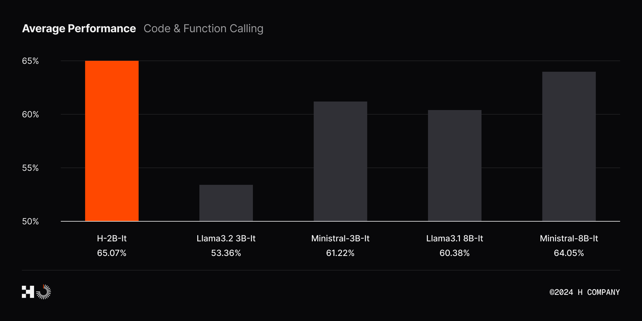 これがHolo1ファミリーとは別の純粋なLLMなのか、あるいはSurfer HのPolicyモデルとしてどう組み込まれているのか、現時点では詳細な情報は不明ですが、2Bパラメータという小型サイズながら、コード生成や関数呼び出しの性能で、Llama 3.2 などのモデルを上回る結果を示しています。