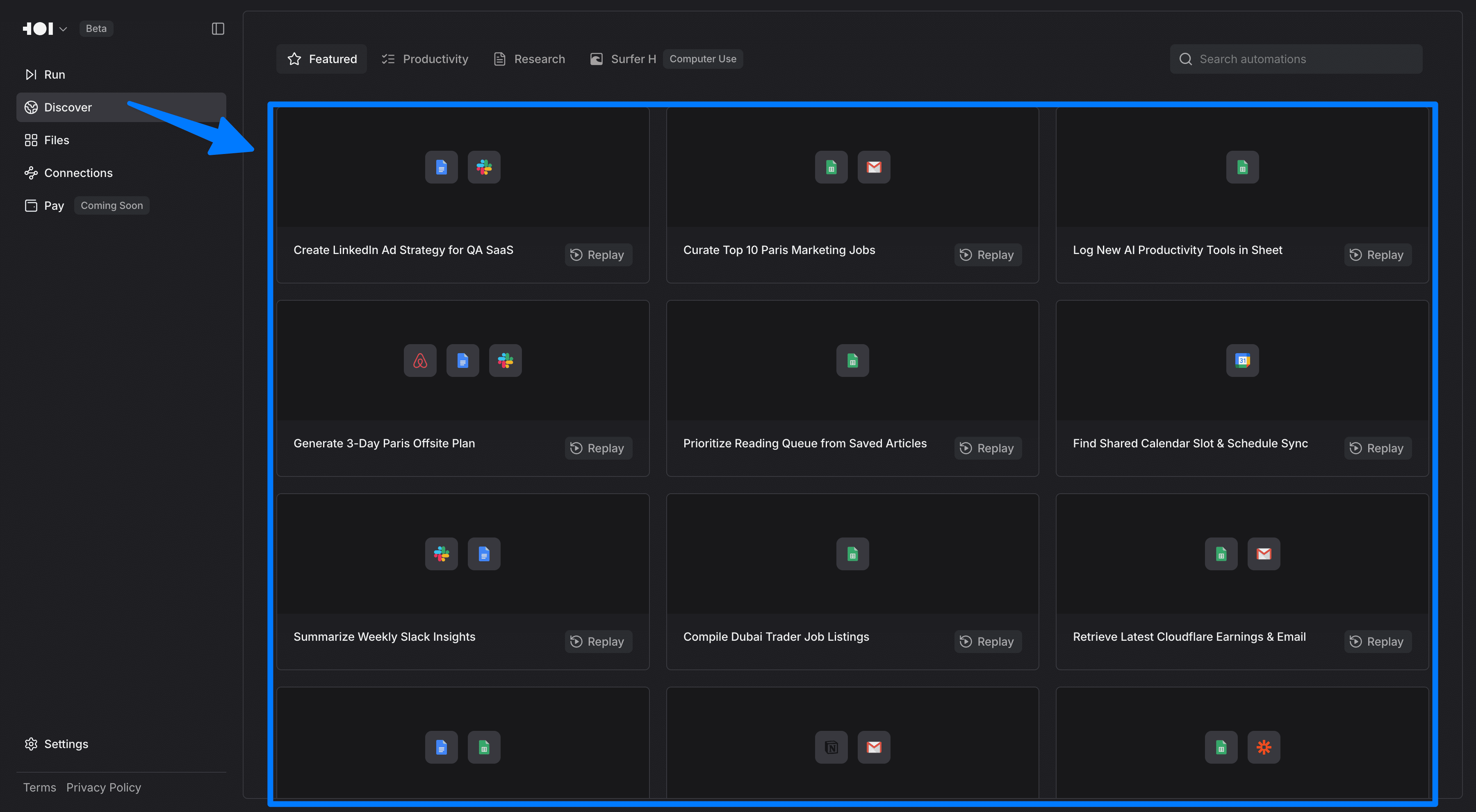 あらかじめ用意された自動化のテンプレート集。「Replay」を押せば、その自動化がどのように動作するかをクレジット消費なしで確認できます。