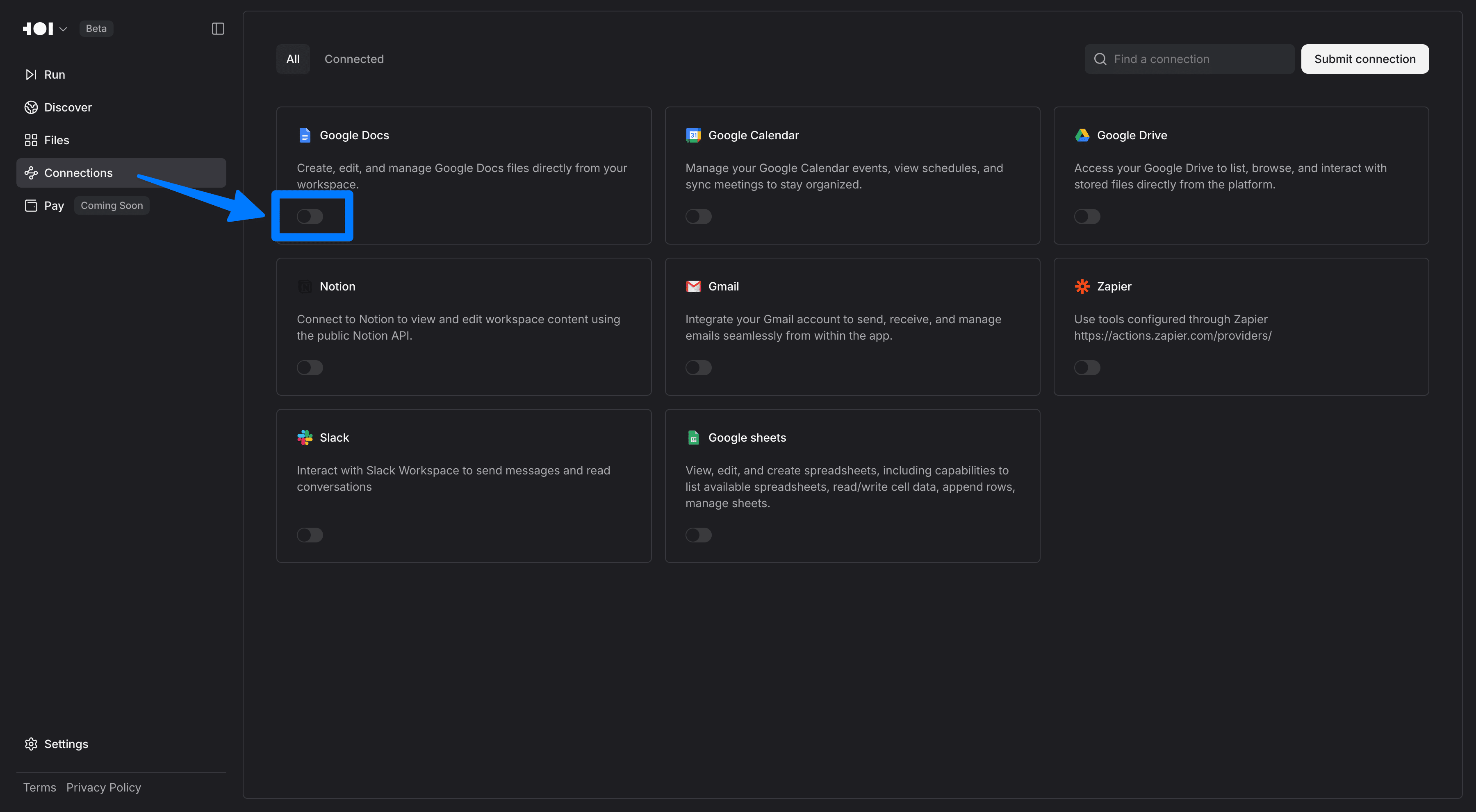 Google DocsやNotion、Slackといった外部サービスとの連携を設定する機能。トグルをオンにすると各サービスとの連携設定に進みます。