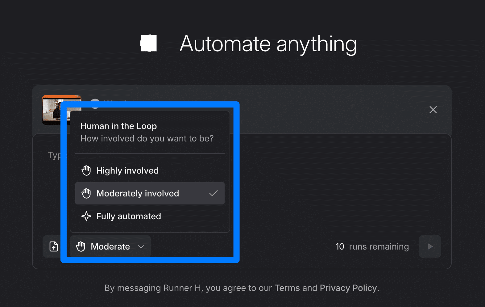 Run(ホーム)画面では、AIの自動化プロセスに人間がどれだけ関与するかを3段階で設定できます。