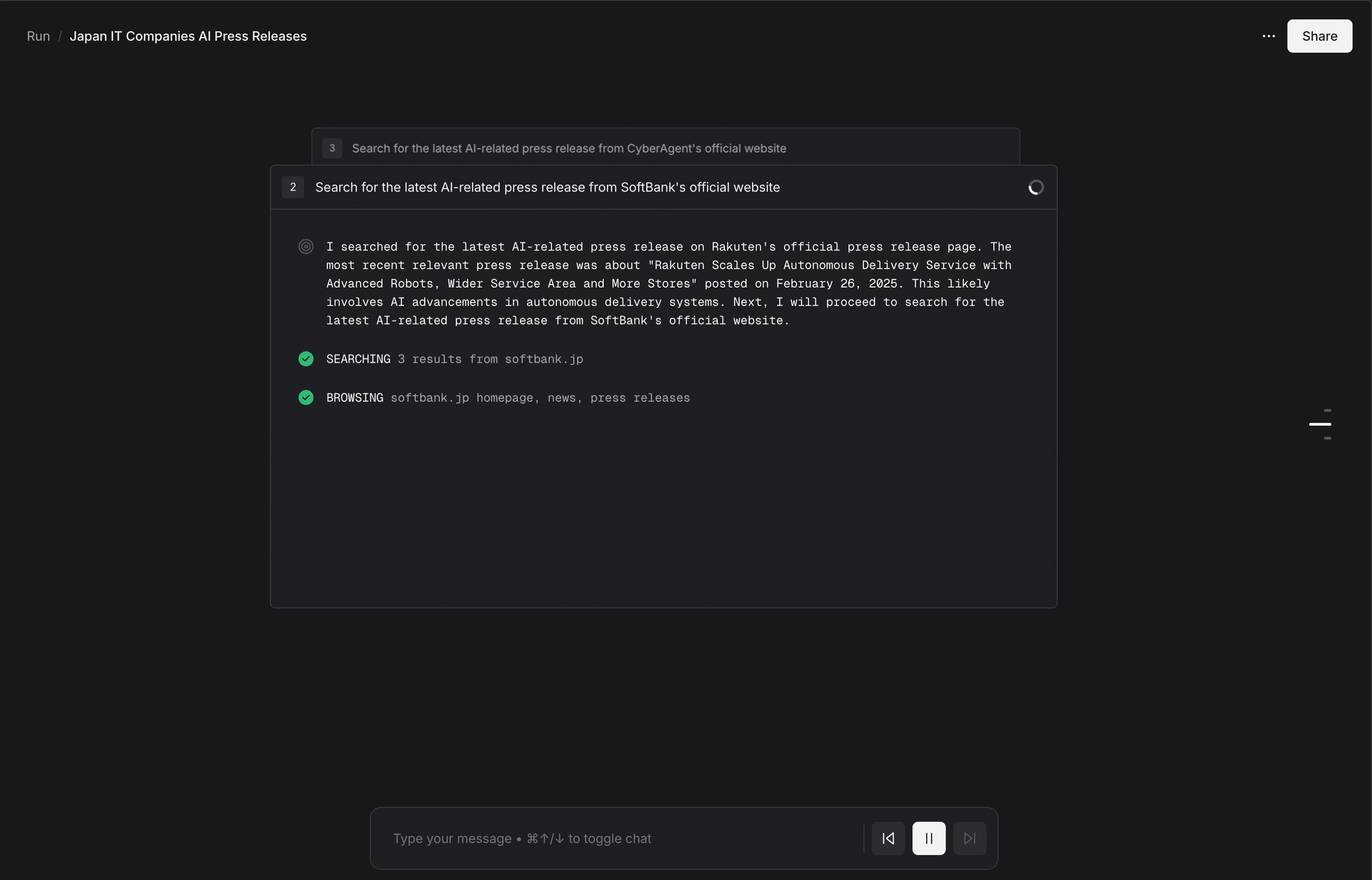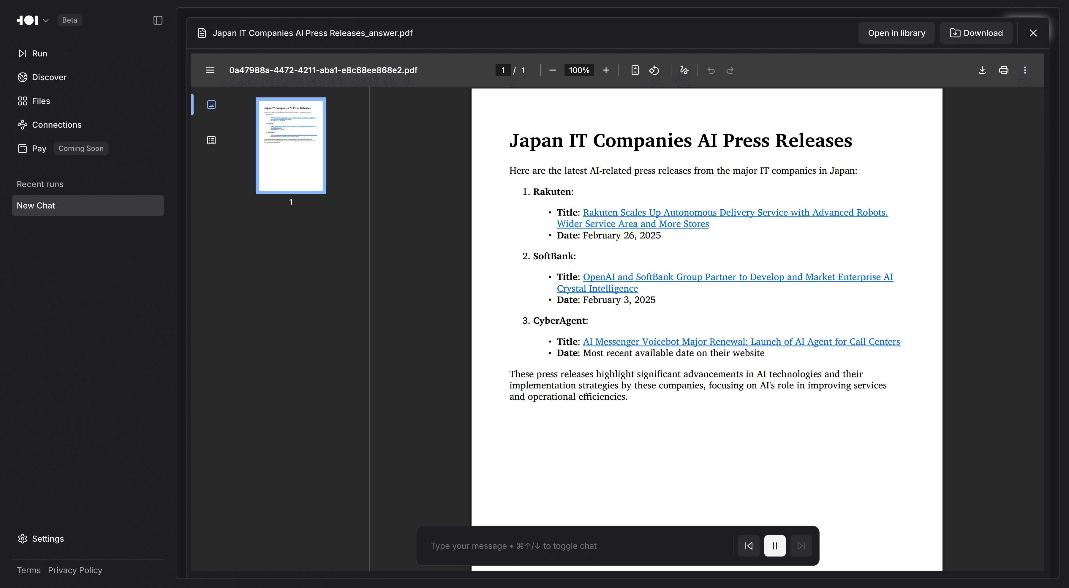 このように、Runner Hはチャットベースの指示から、Webリサーチから結果のファイル出力、保存までを一貫して行う機能を備えています。