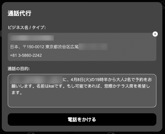 機能: AIがユーザーに代わり、指定した電話番号へ実際に電話を発信する機能。主に、店舗への予約や簡単な問い合わせといった用途が想定されています。