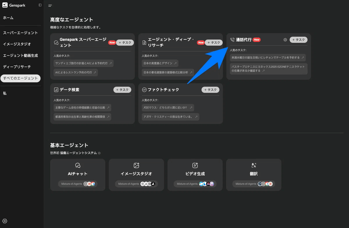 Gensparkは、ユーザーの指示に基づいて、AIが情報収集、分析、コンテンツ生成といった様々なタスクを自動で実行する、いわゆる「AIエージェント」型のプラットフォームの一つです。今回紹介する「Call For Me Agent」以外にも、レポート作成や画像/動画生成など、複数の機能を備えています。
