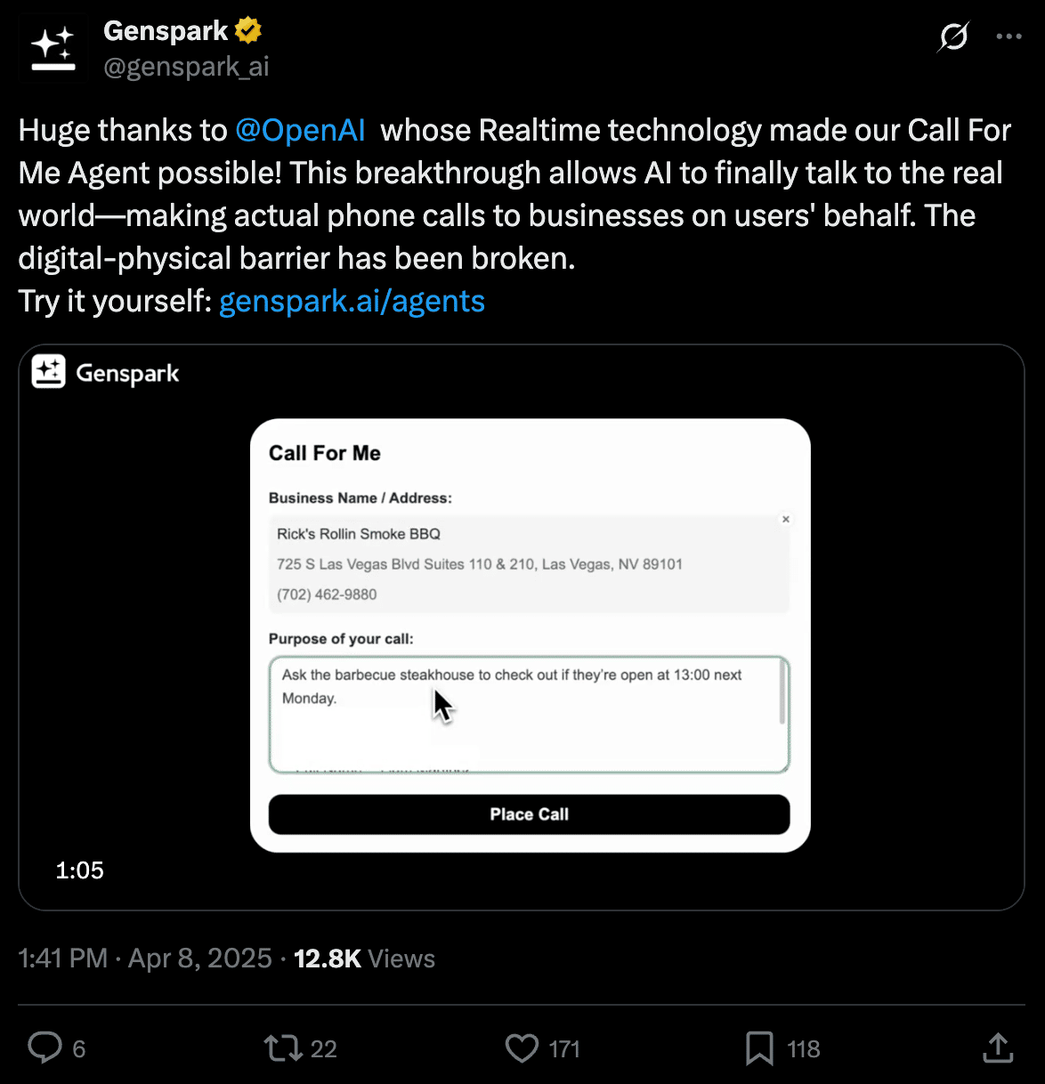 日本語訳:「Call For Me Agent」の実現にあたり、リアルタイム技術を提供してくれた @OpenAI に心より感謝します。