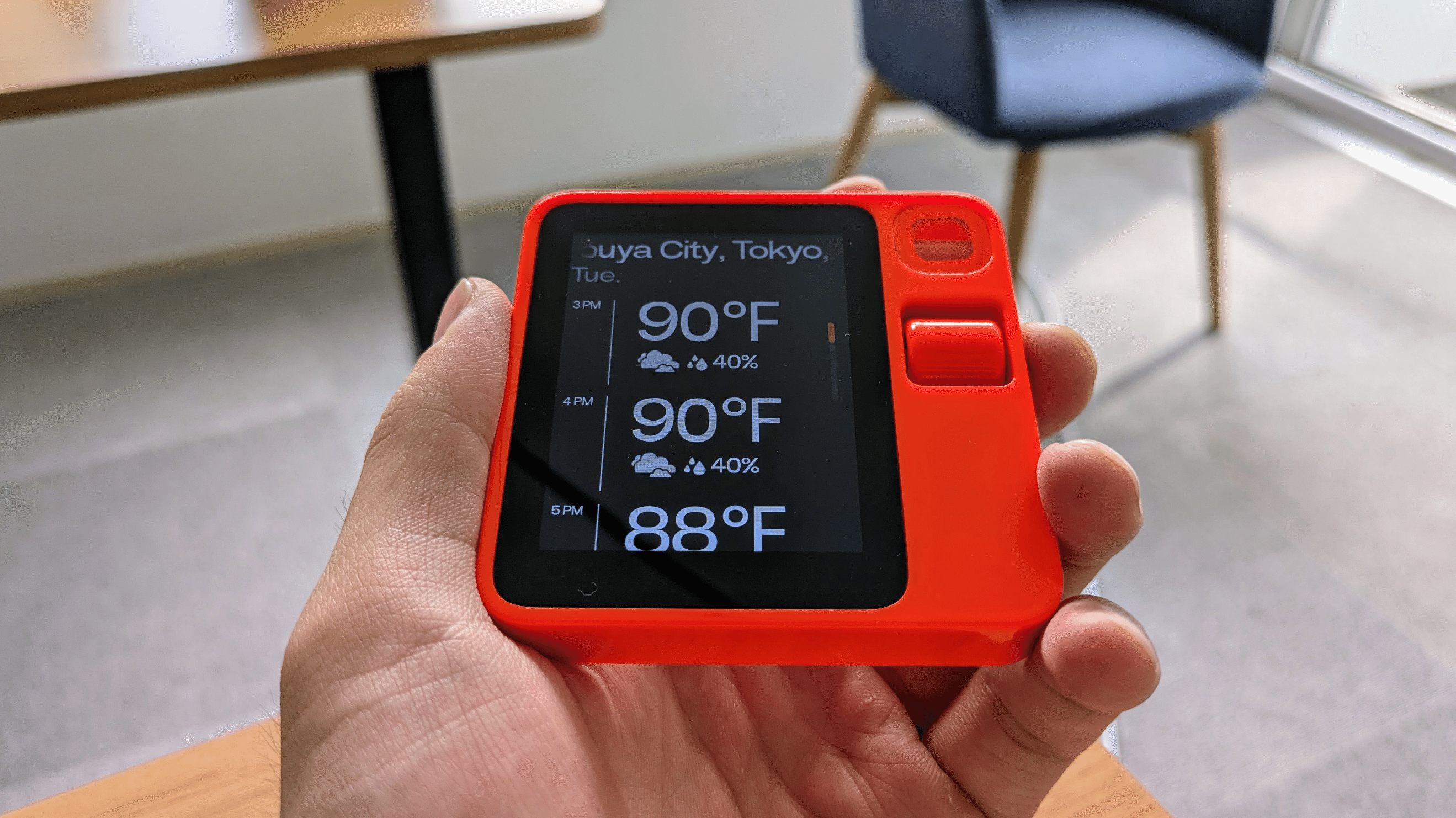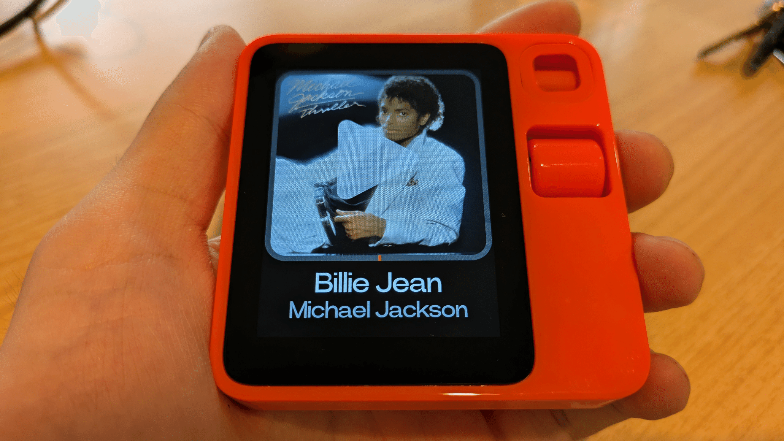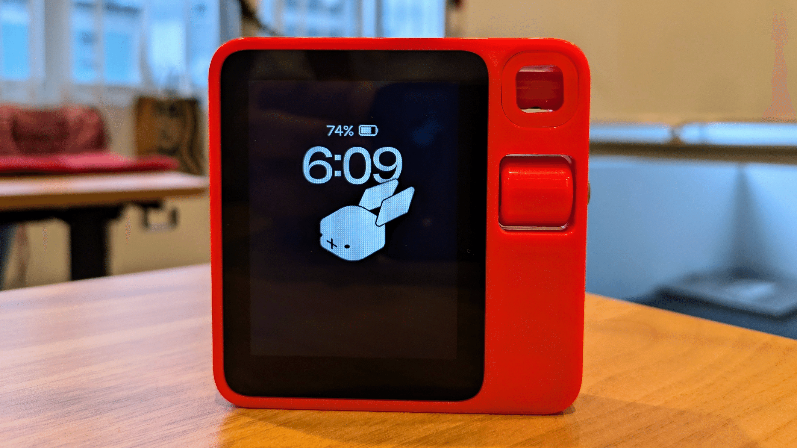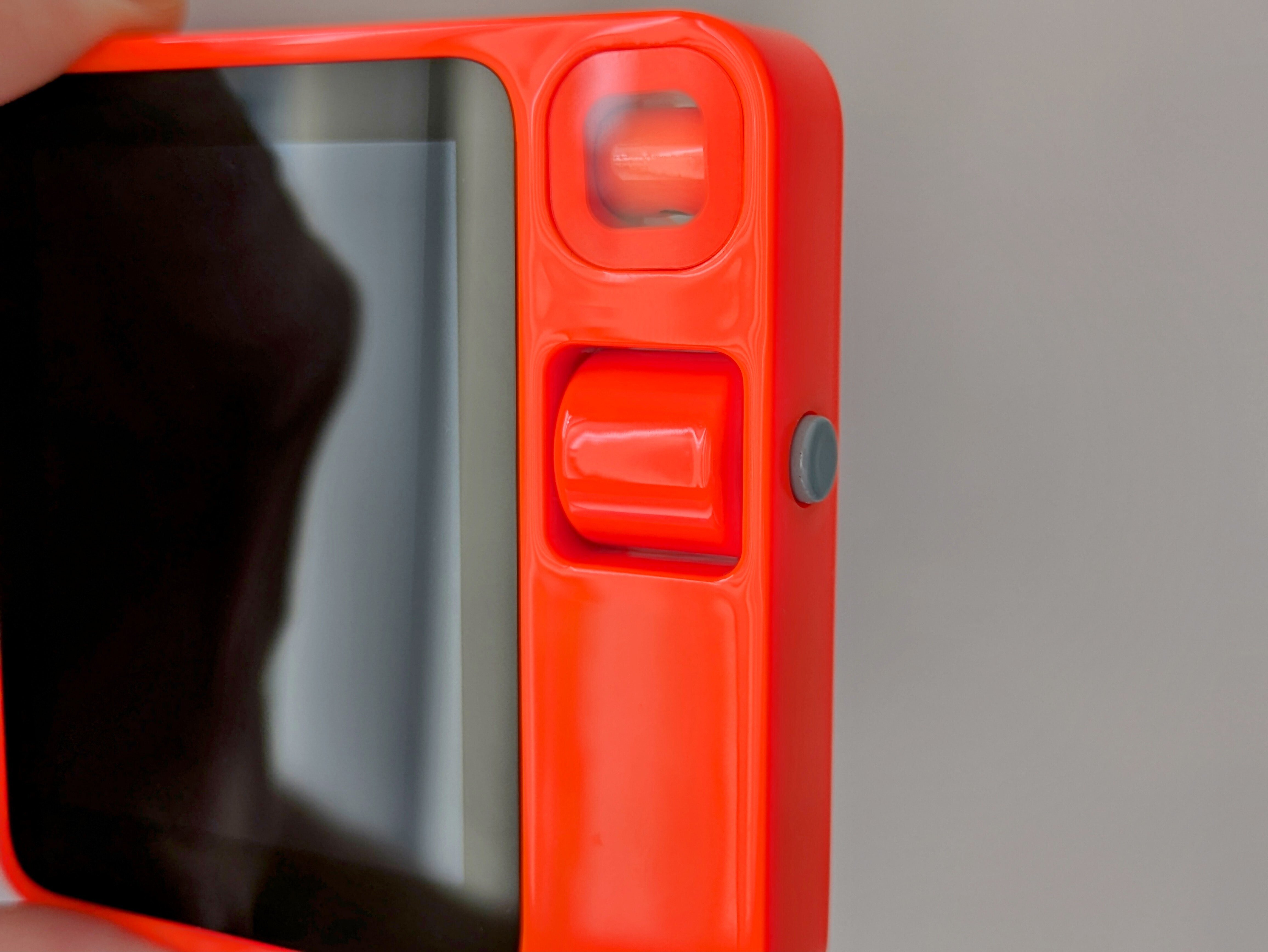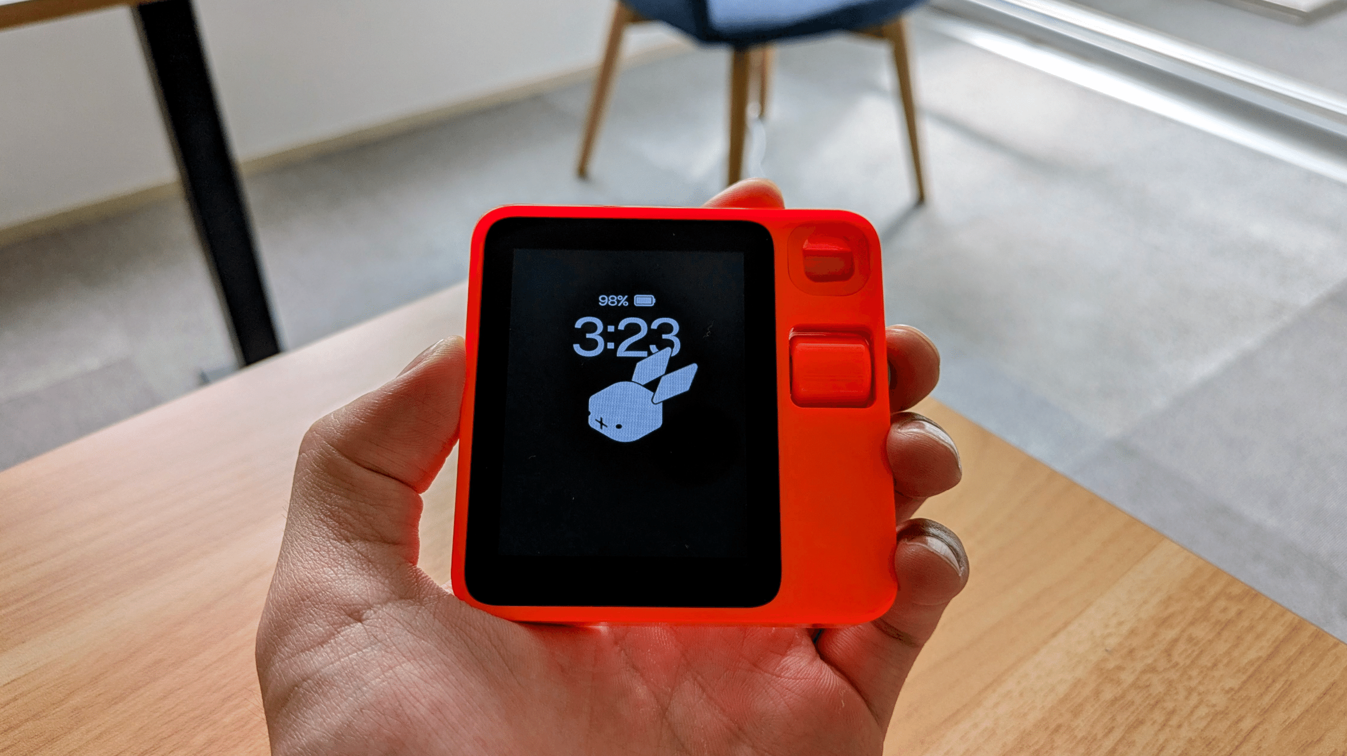手のひらに収まるコンパクトなサイズ感と、鮮やかなオレンジレッドのデバイスは、レトロな雰囲気を感じさせます。