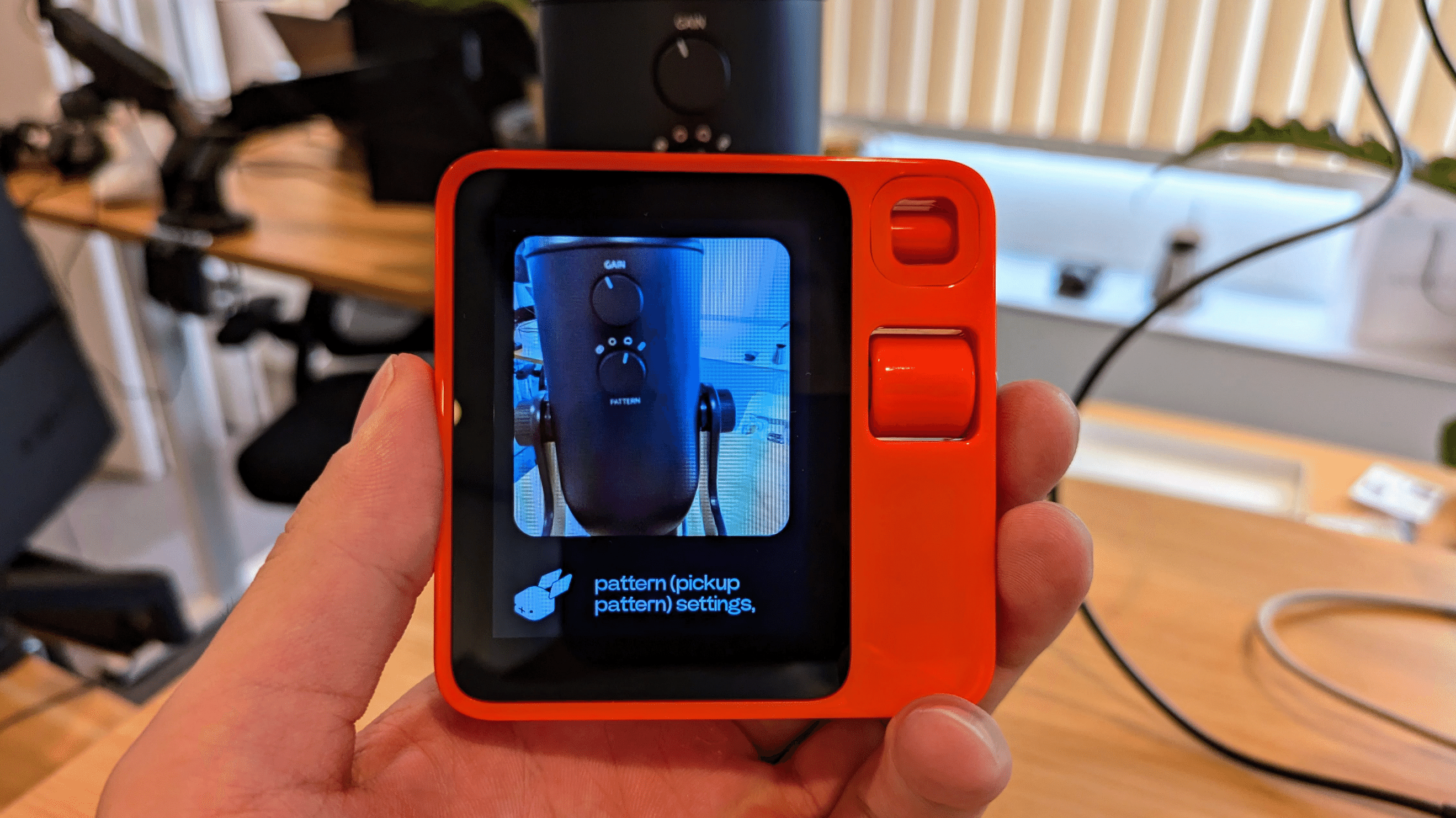 一方、使用している Yeti マイクの画像を Rabbit r1 に見せて、パターン設定について質問したところ、「GAIN」ノブまでは認識できたものの、細かいロゴまでは認識できませんでした。