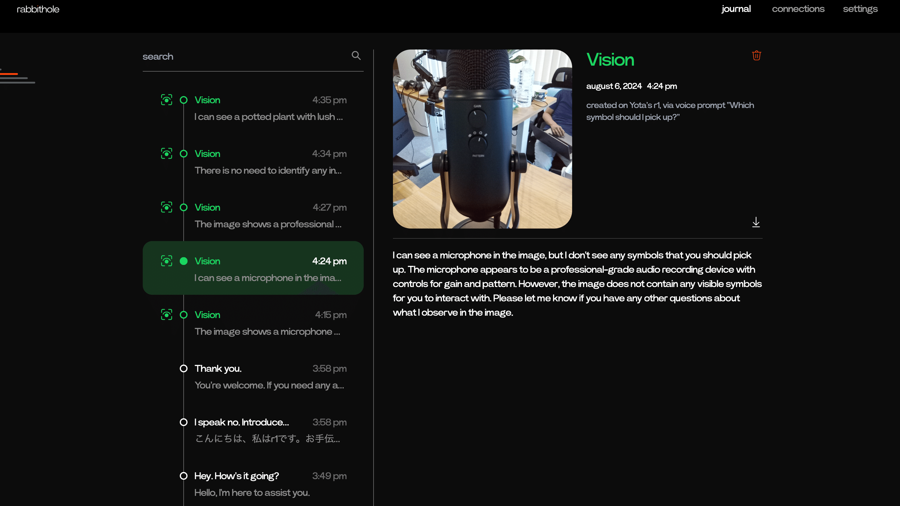 Rabbit r1 には、Journal と呼ばれる機能があり、過去の会話履歴をウェブサイト上で確認することができます。