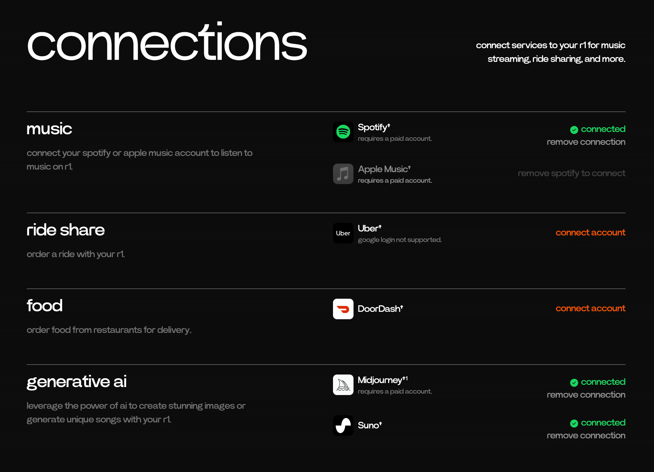 連携できるアプリは、音楽、配車サービス、フードデリバリー、また、画像生成AIのMidjourney、音楽生成AI Suno があります。