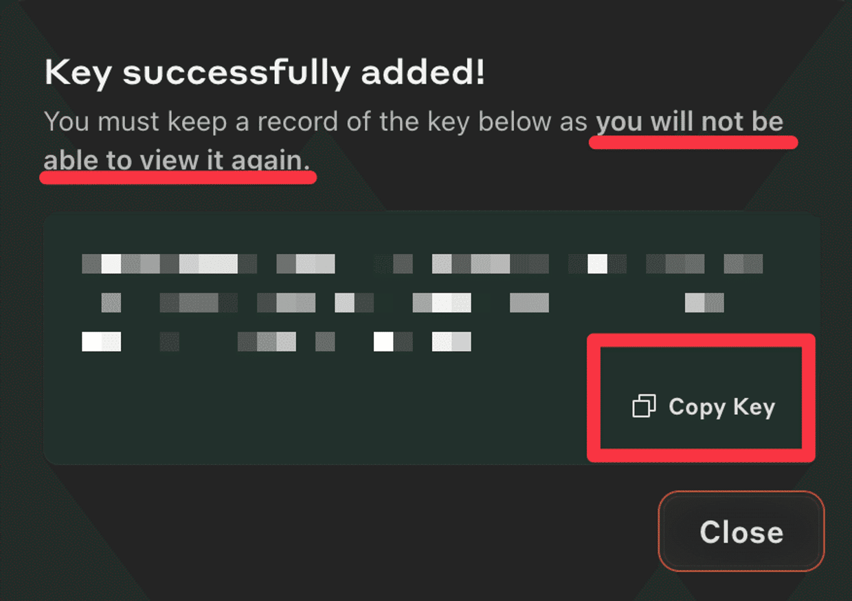 もう一度確認することは不可能なので、安全な場所に保管したことを確認してから、Closeボタンを押しましょう。