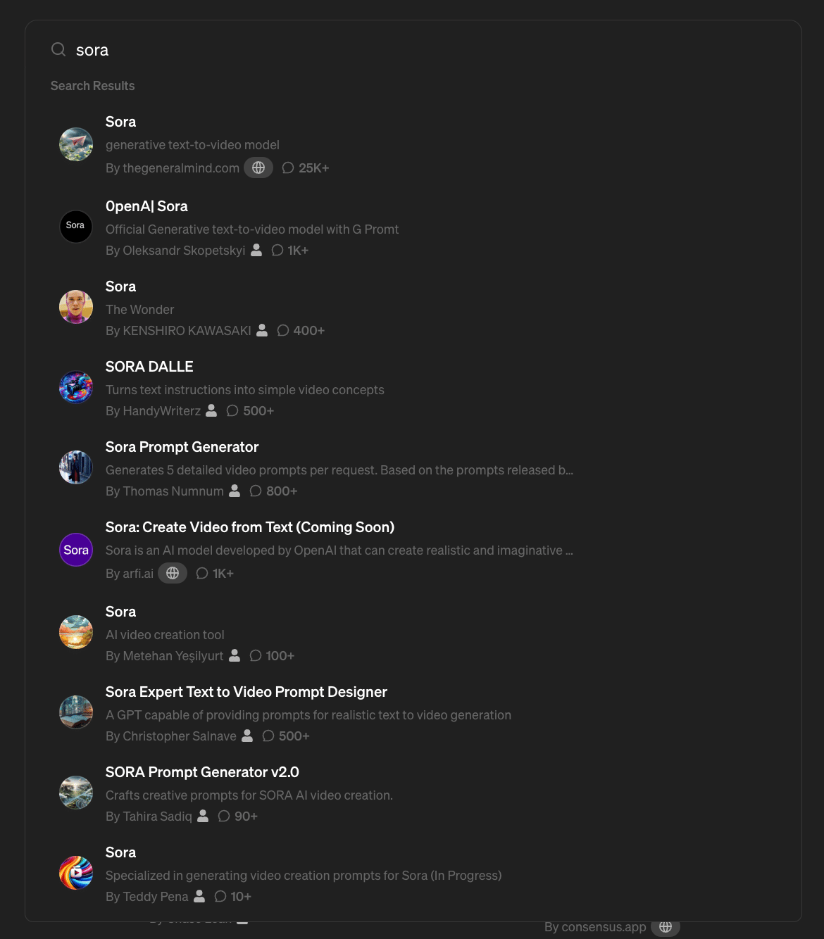 なんと、GPTストアには既に無数の"Sora"と称したGPTsが挙げられており、トップに上がるものはほぼ全て先ほど述べたSoraモデルに紐づけられているGPTsになっています。