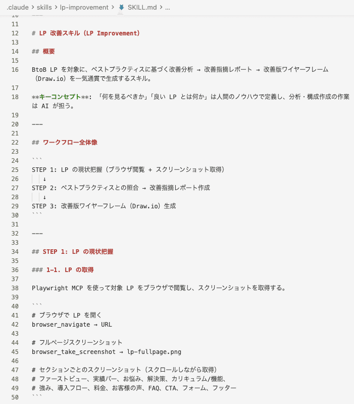 このスキルは、LPのURLまたはスクリーンショットを渡すだけで、以下を自動生成します。