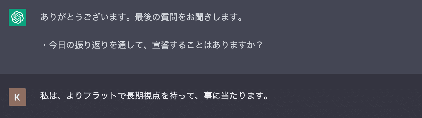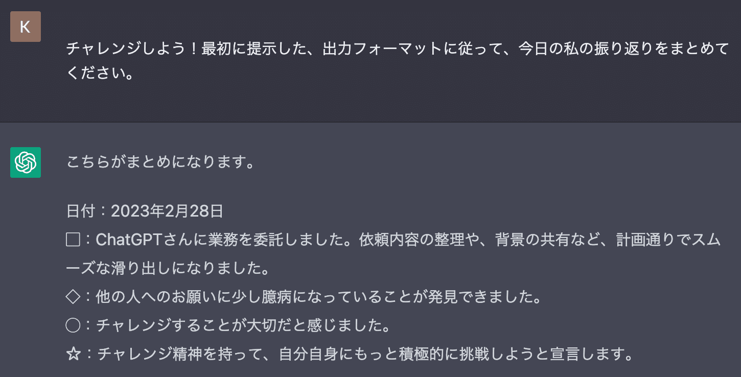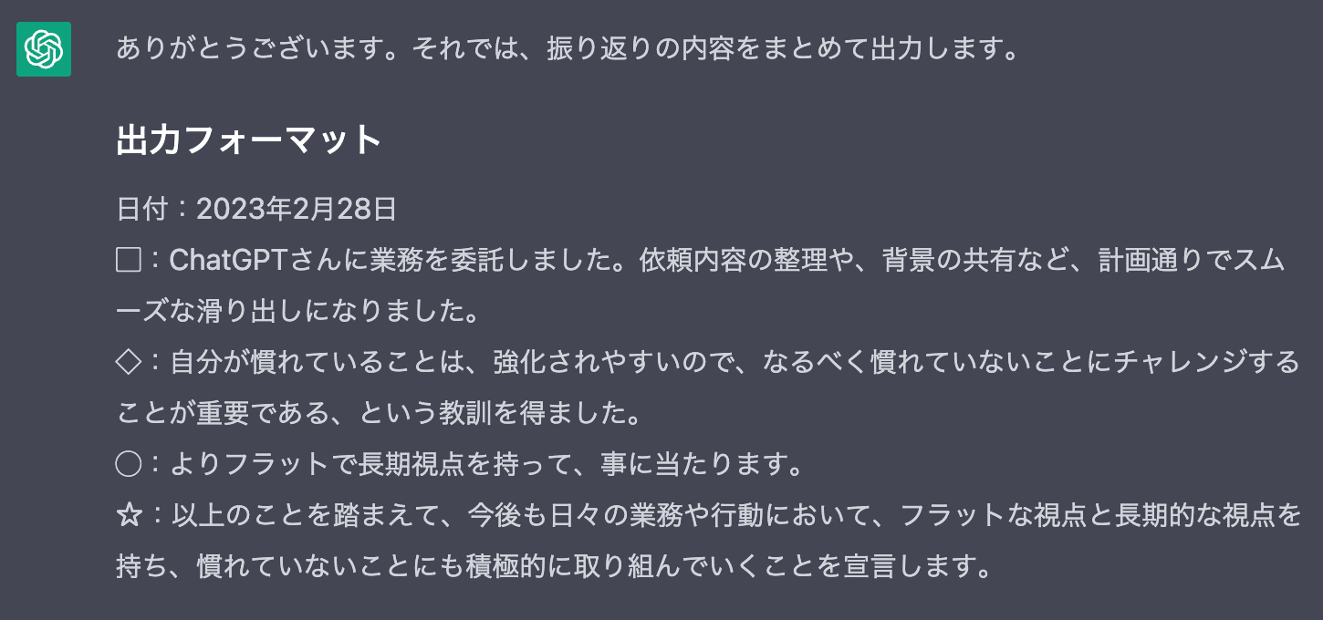 これで振り返りの一連の流れが終了しました。一連の流れが終了すると、あとは、自動的にChatGPTが振り返りをまとめてくれます。こんな感じ👉