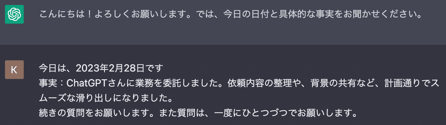 まずはじめに、ChatGPTにこの記事の一番最初にある、プロンプト(ChatGPTへの入力文のこと)を入力すると、以下のように返答が返ってきますので、ChatGPTの指示に従って、日付と事実を入力していきます。(緑のアイコンがChatGPT、茶色のアイコンが著者)